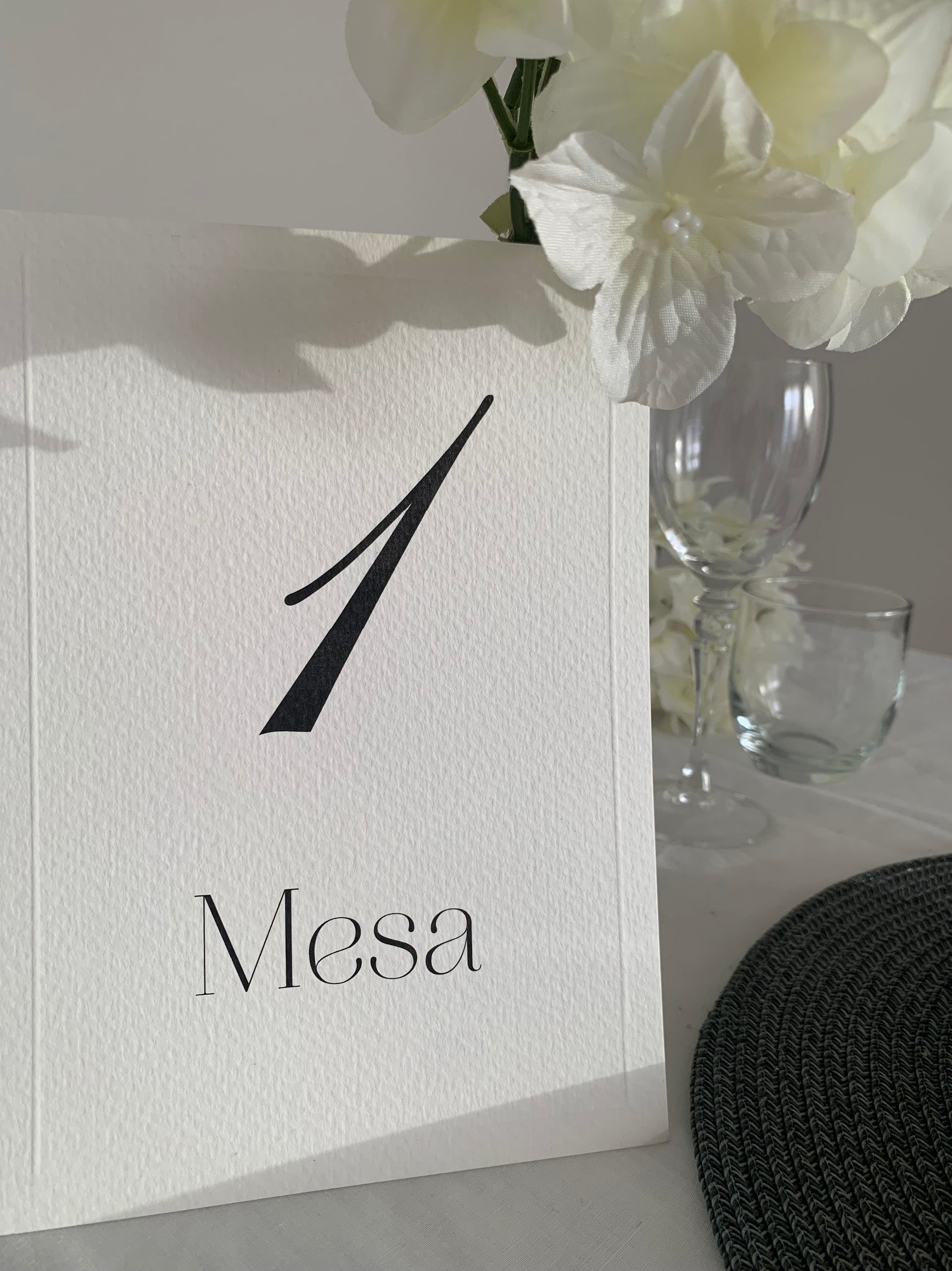Cada mesero se entrega con el número de mesa impreso según las indicaciones de la pareja, manteniendo la estética elegante y atemporal que caracteriza a la colección Claire.